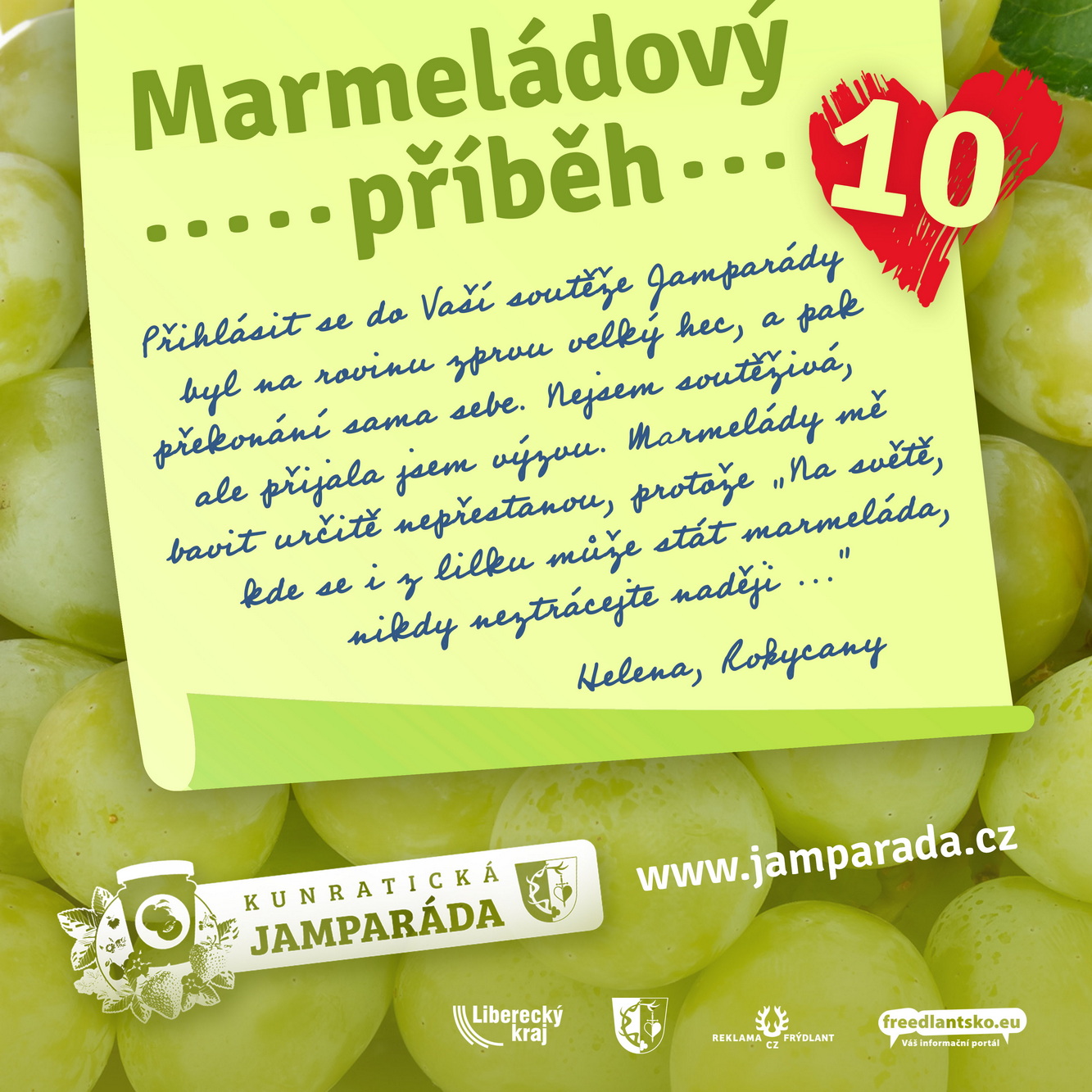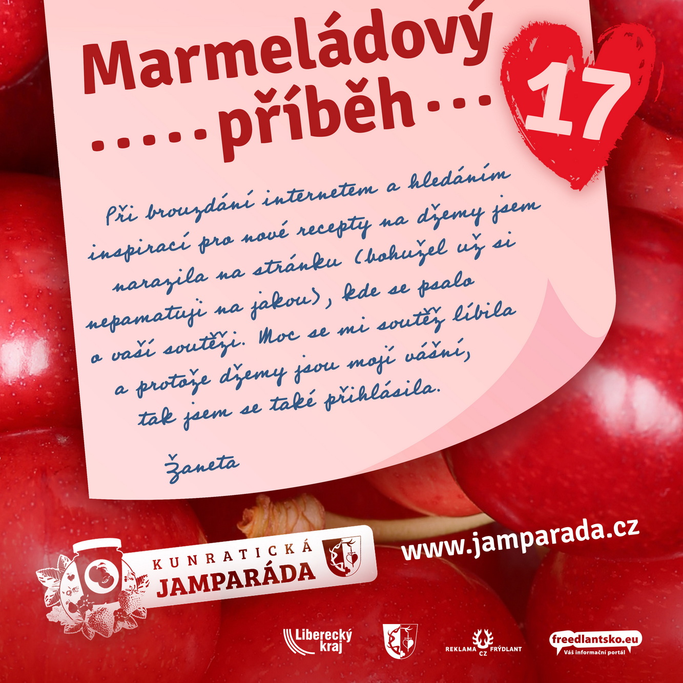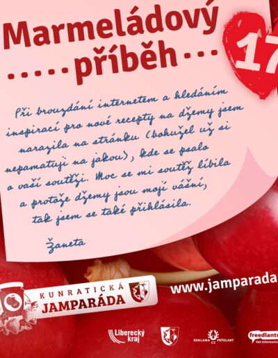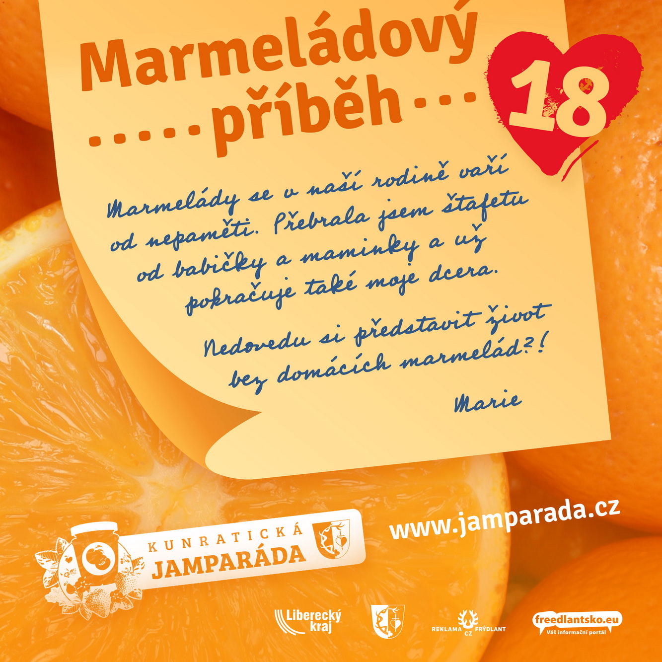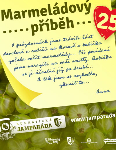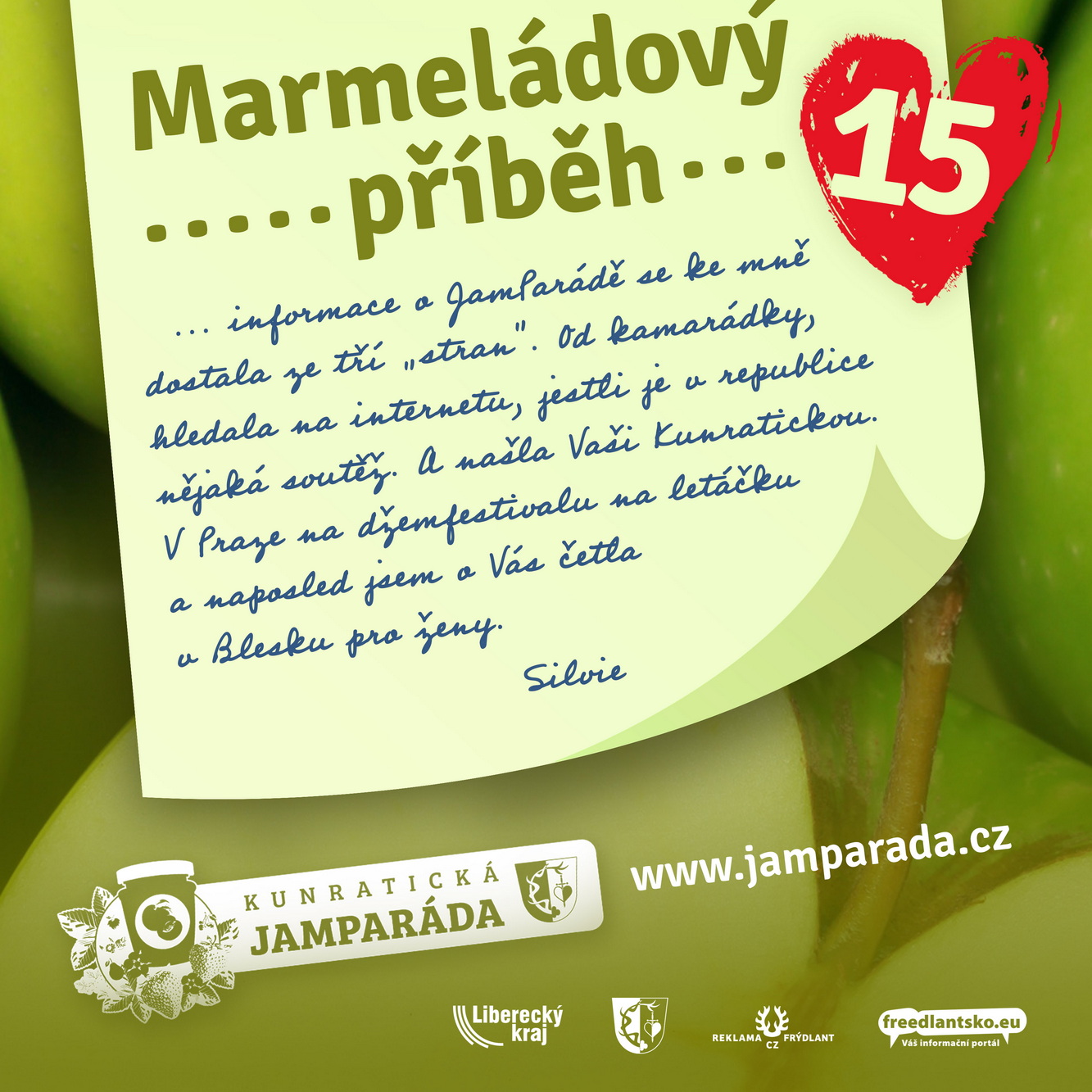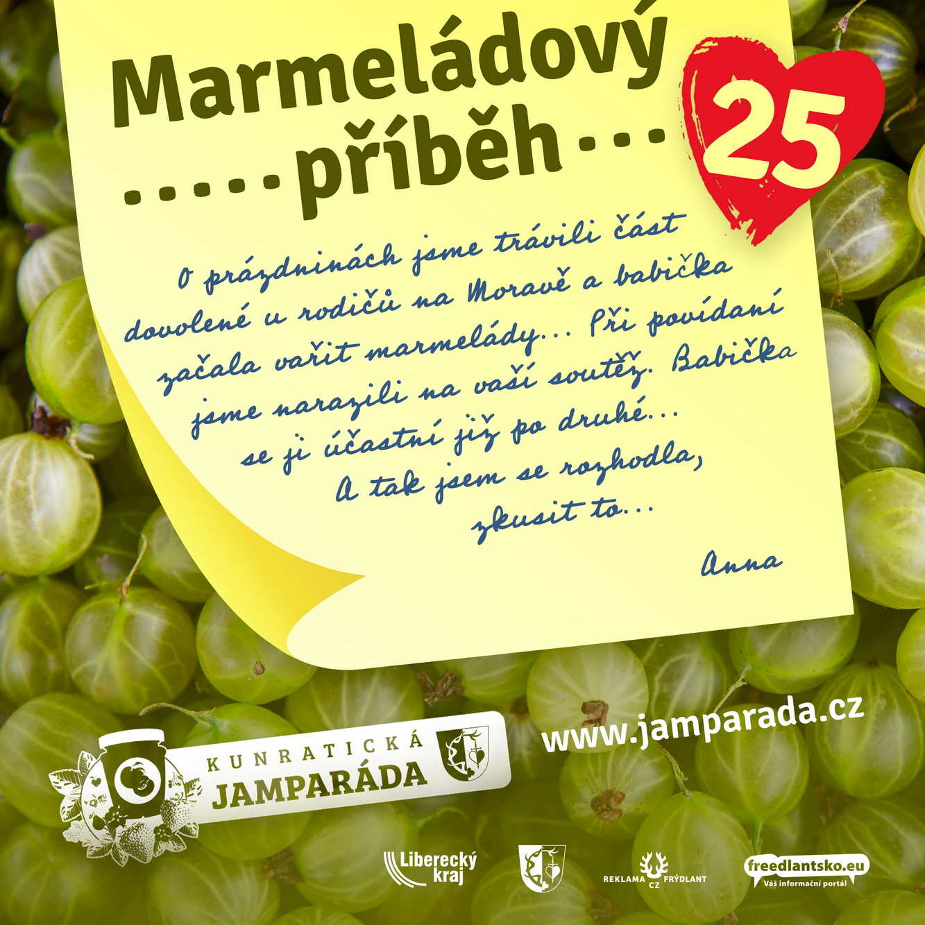 Každoročně nám chodí soutěžní vzorky zásilkami z celé republiky. Když je to ještě možné a stíháme odesílat zpět soutěžícím potvrzené přihlášky e-mailem, doplňujeme zprávu drobnou prosbou o napsání několika vět o tom, jak se dotyční k vaření marmelád dostali, popřípadě jak se o naší soutěži dozvěděli. Vždycky se pak těšíme na odpovědi v podobě marmeládového příběhu. V současnosti jich máme více jak 60 a za každý z nich jsme velice rádi, neboť je z nich cítit láska k rodině, k tradici i k přírodě.