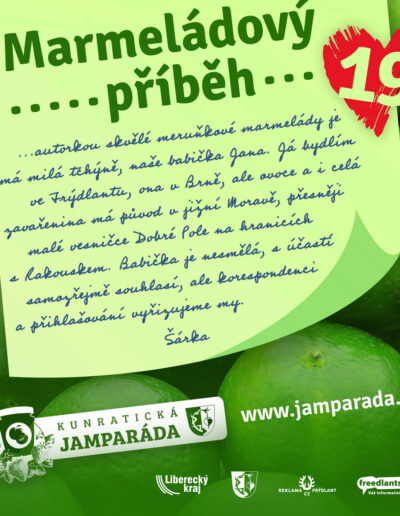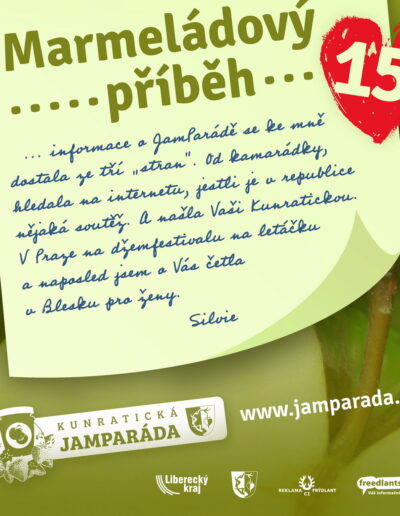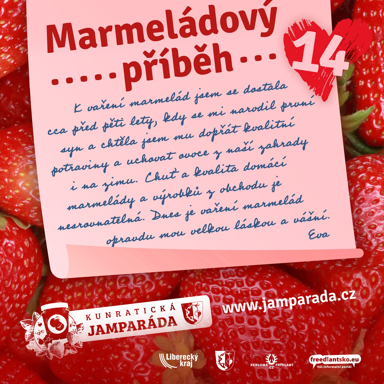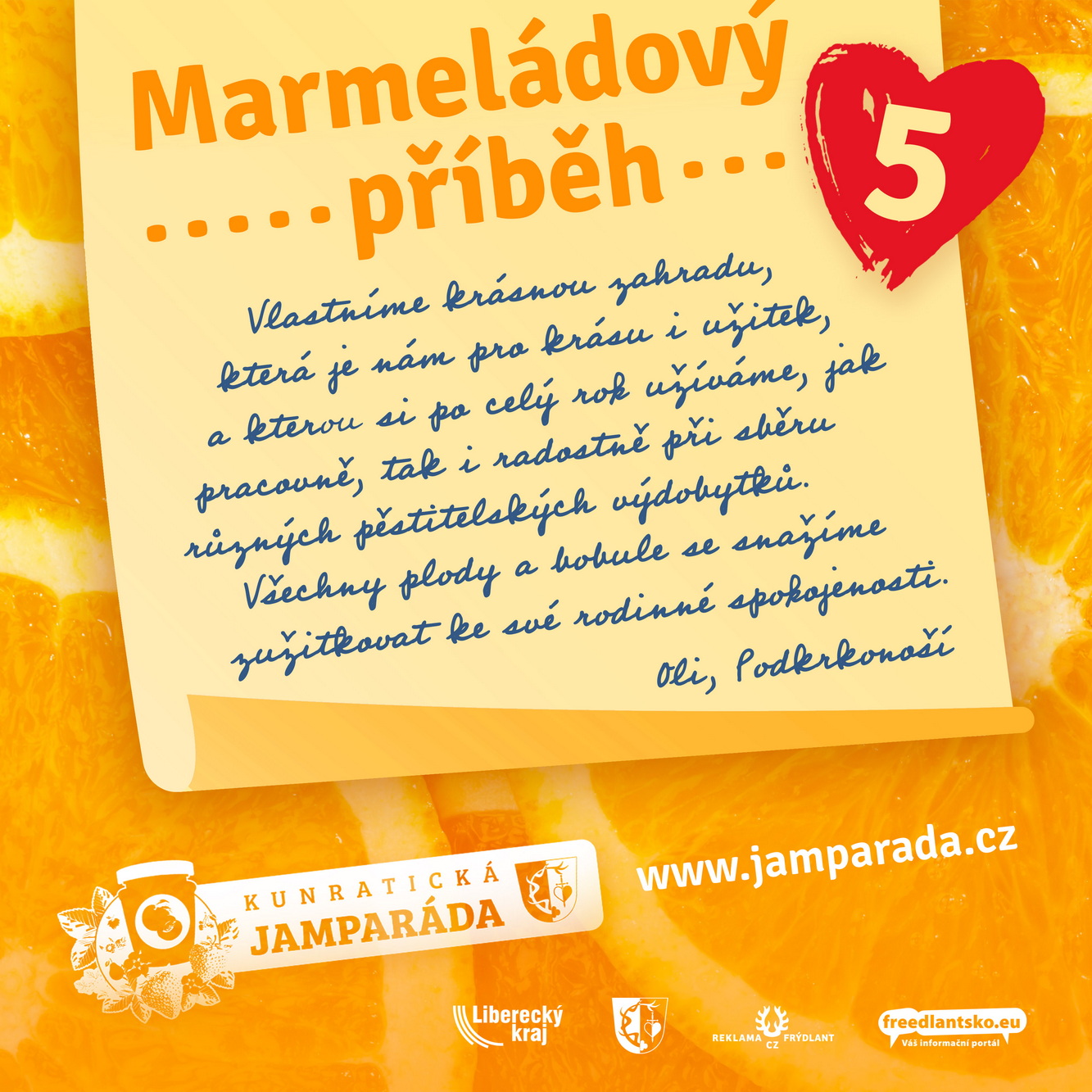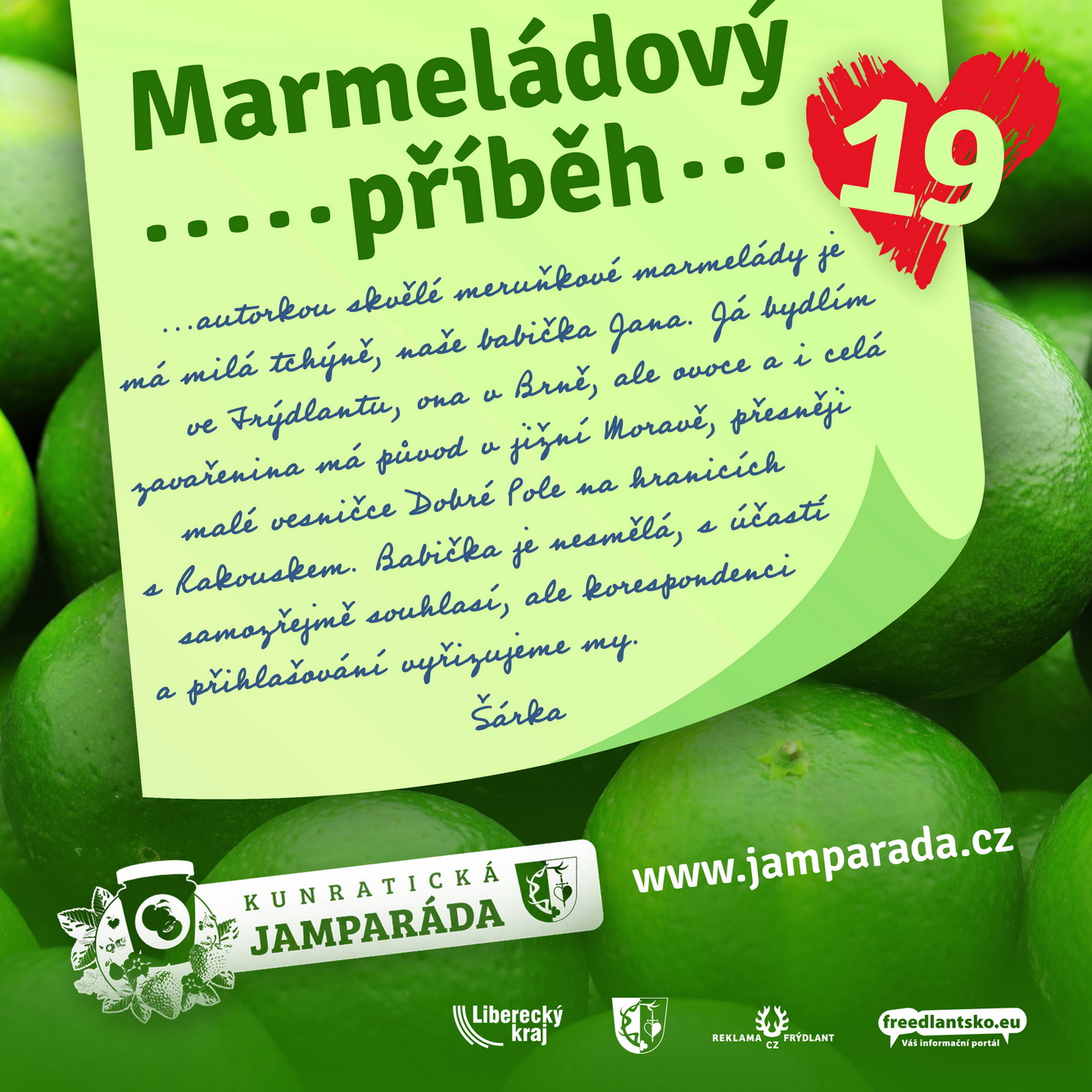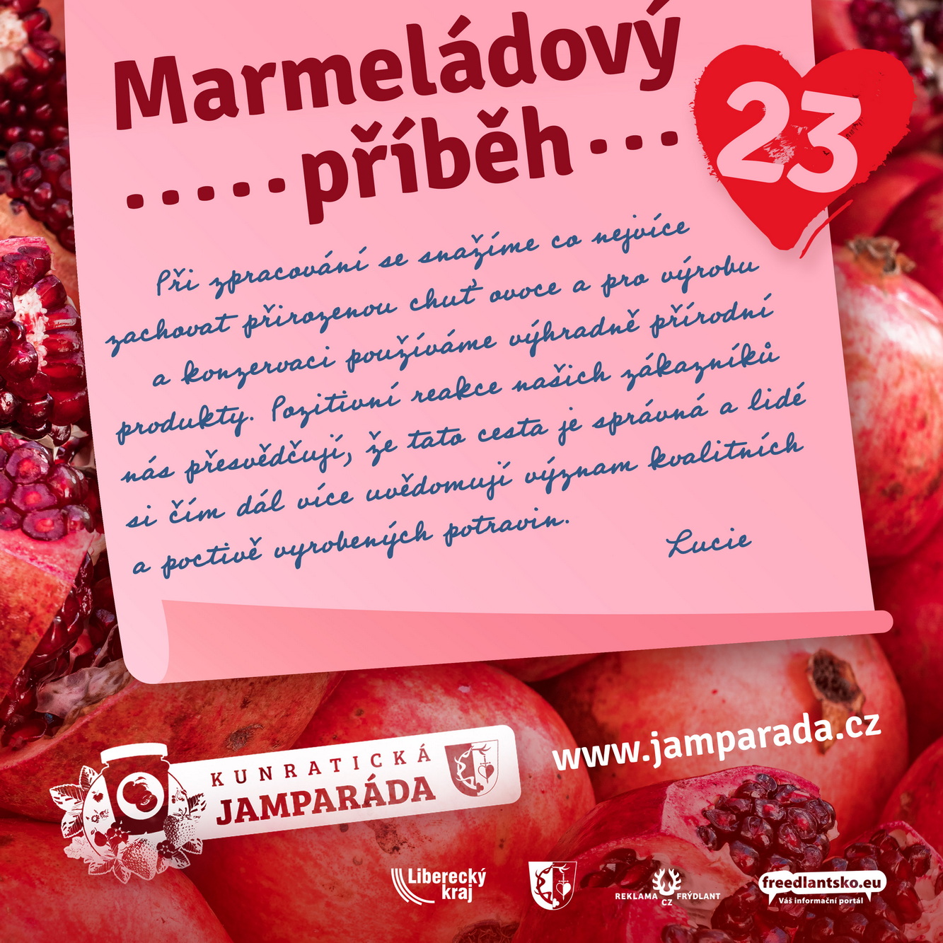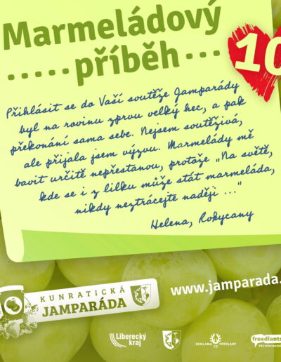 Každoročně nám chodí soutěžní vzorky zásilkami z celé republiky. Když je to ještě možné a stíháme odesílat zpět soutěžícím potvrzené přihlášky e-mailem, doplňujeme zprávu drobnou prosbou o napsání několika vět o tom, jak se dotyční k vaření marmelád dostali, popřípadě jak se o naší soutěži dozvěděli. Vždycky se pak těšíme na odpovědi v podobě marmeládového příběhu. V současnosti jich máme více jak 60 a za každý z nich jsme velice rádi, neboť je z nich cítit láska k rodině, k tradici i k přírodě.